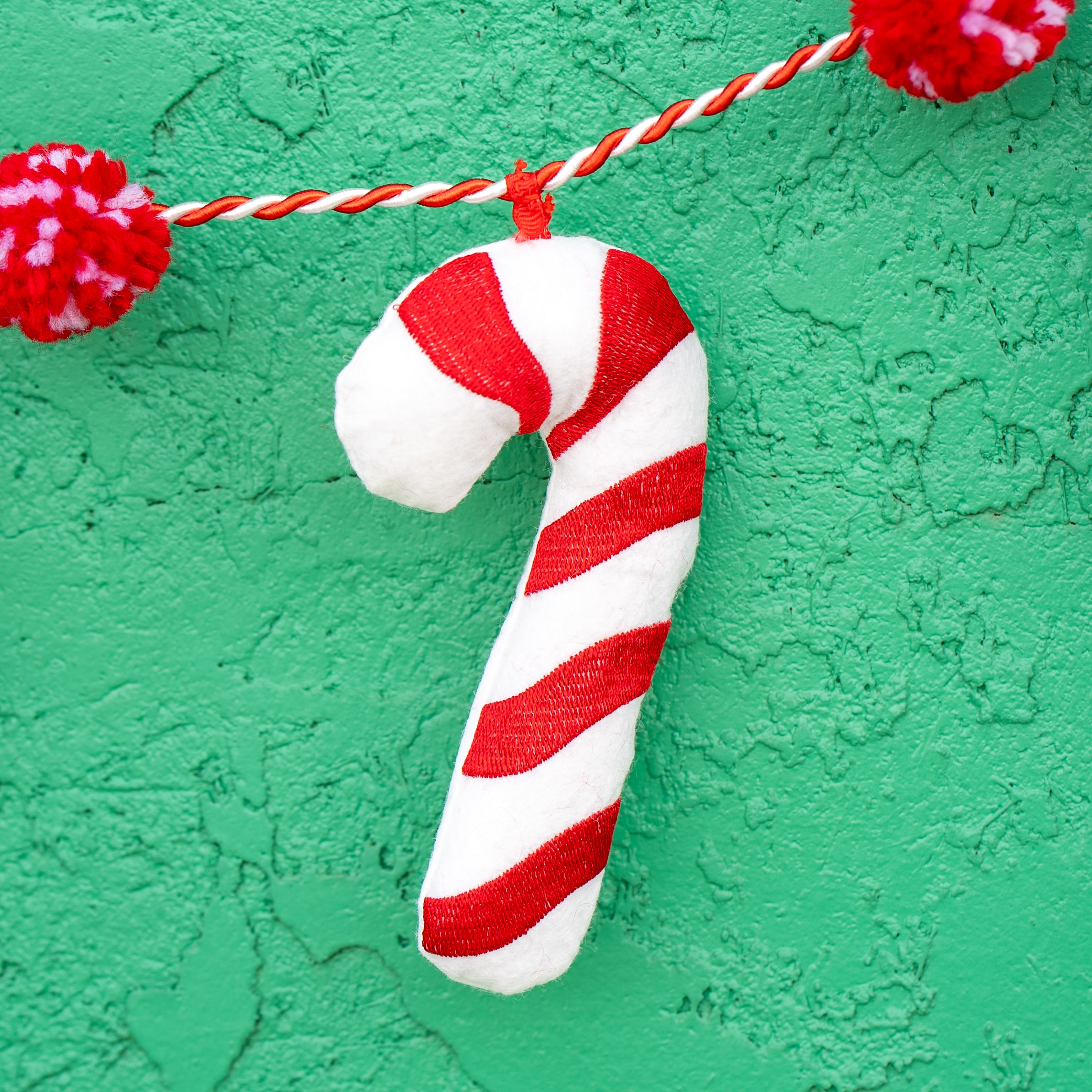 - This red and white garland features pom-poms, candy canes, and peppermint candies.